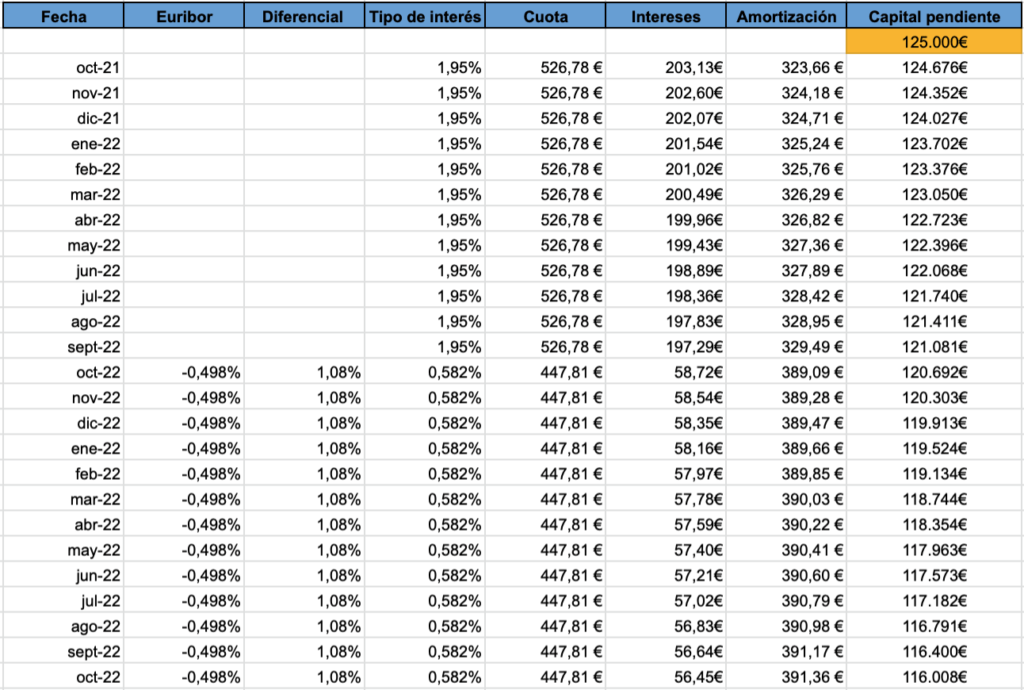 Capital: la columna del capital hace referencia al dinero prestado que devolvemos en cada cuota. Por ello, a medida que avance el pago de las cuotas, debemos menos capital al banco.