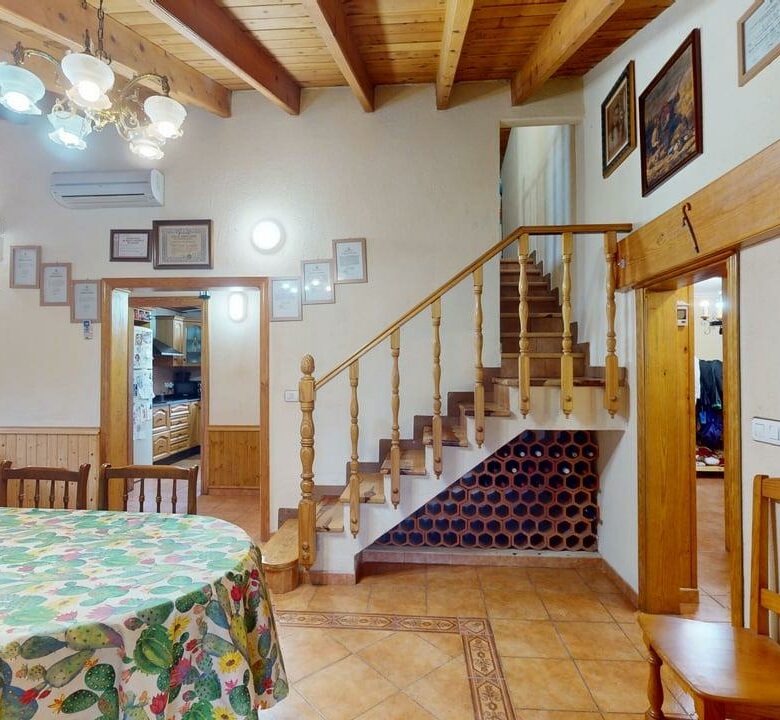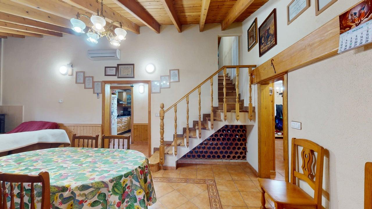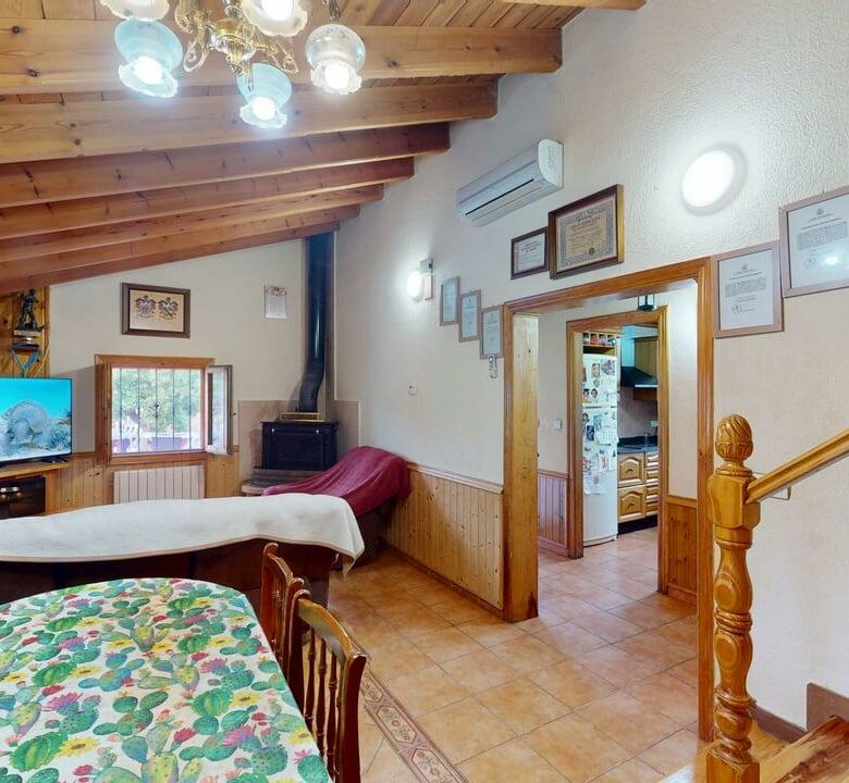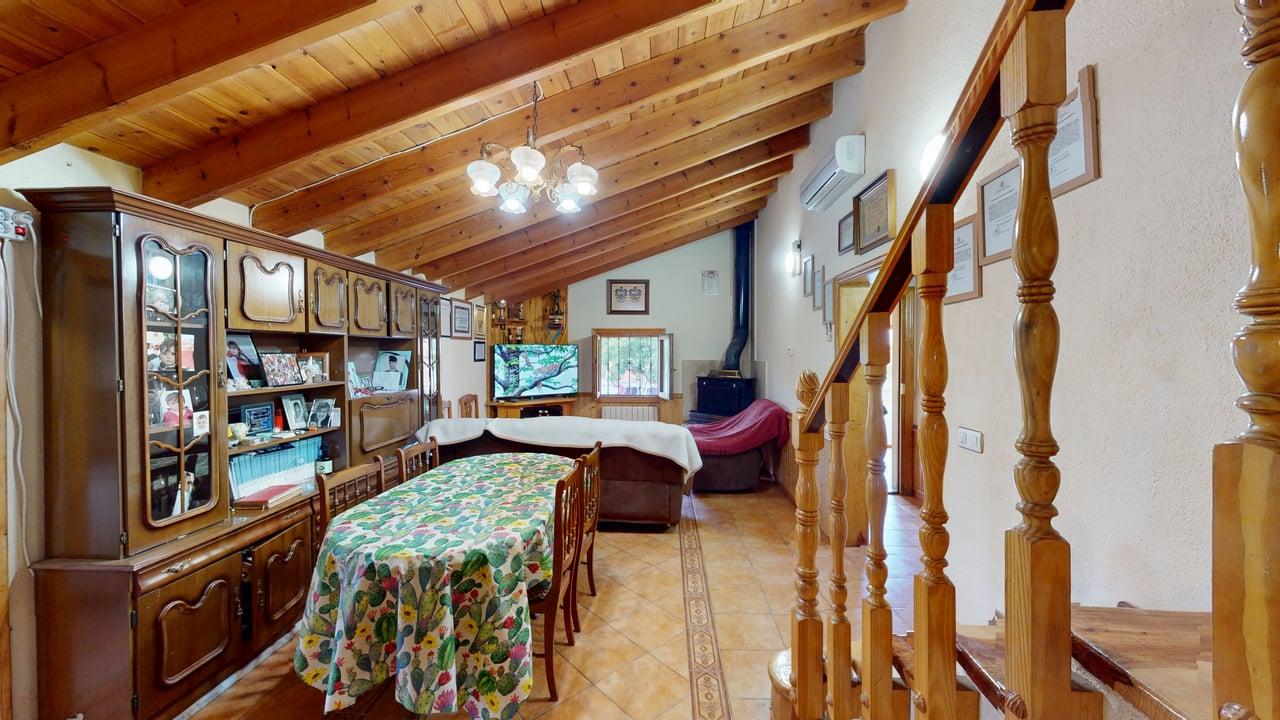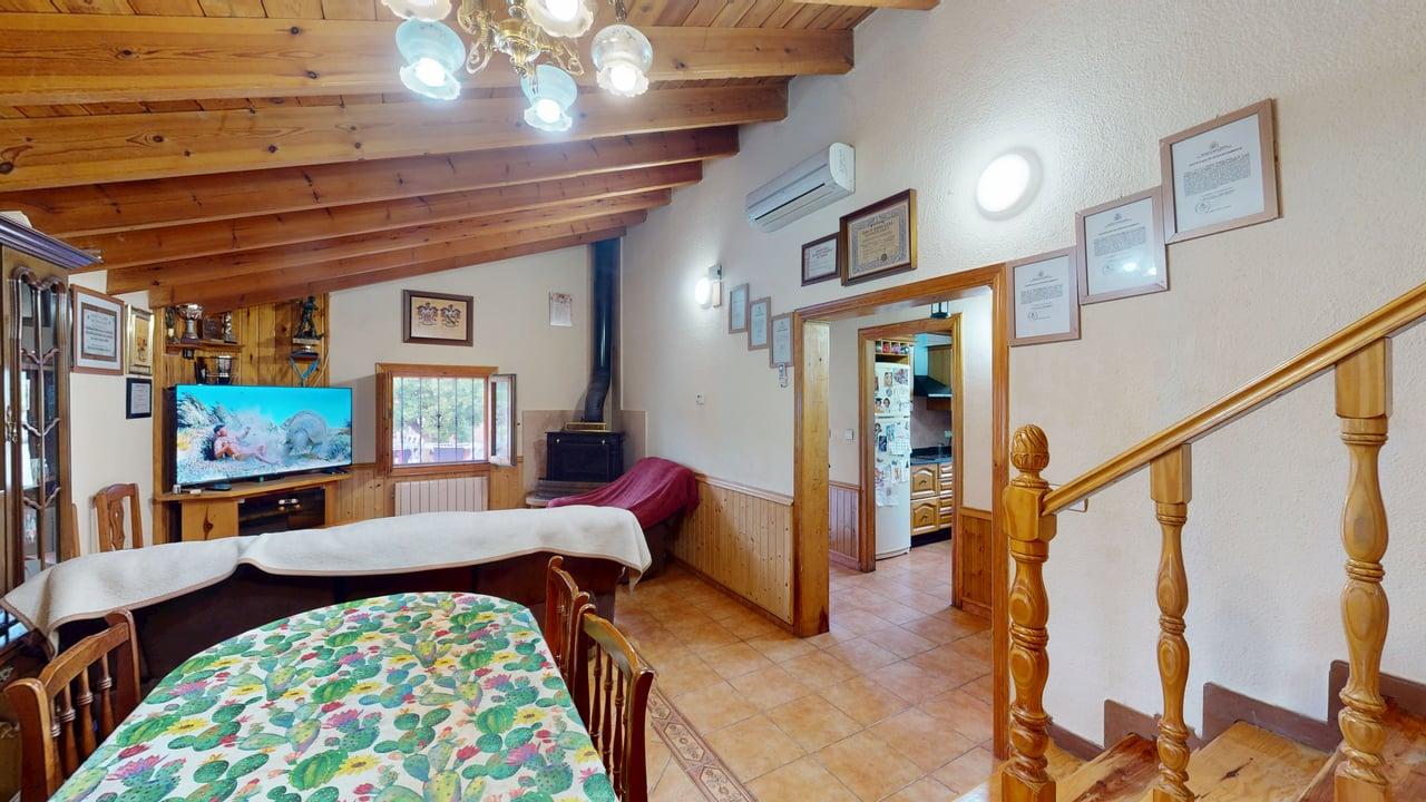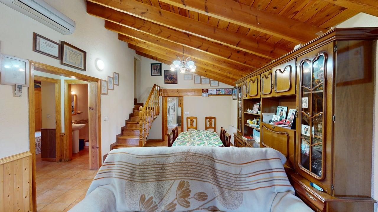 La vivienda dispone de 222 m² construidos, distribuidos en dos plantas con espacios amplios y funcionales. Al acceder encontramos un acogedor porche que da paso a una cocina totalmente equipada, un aseo completo y una habitación individual. Desde aquí llegamos a un gran salón-comedor con chimenea, muy luminoso y perfecto para reuniones familiares, que además conecta con una amplia despensa desde la que se accede a una cochera cerrada.