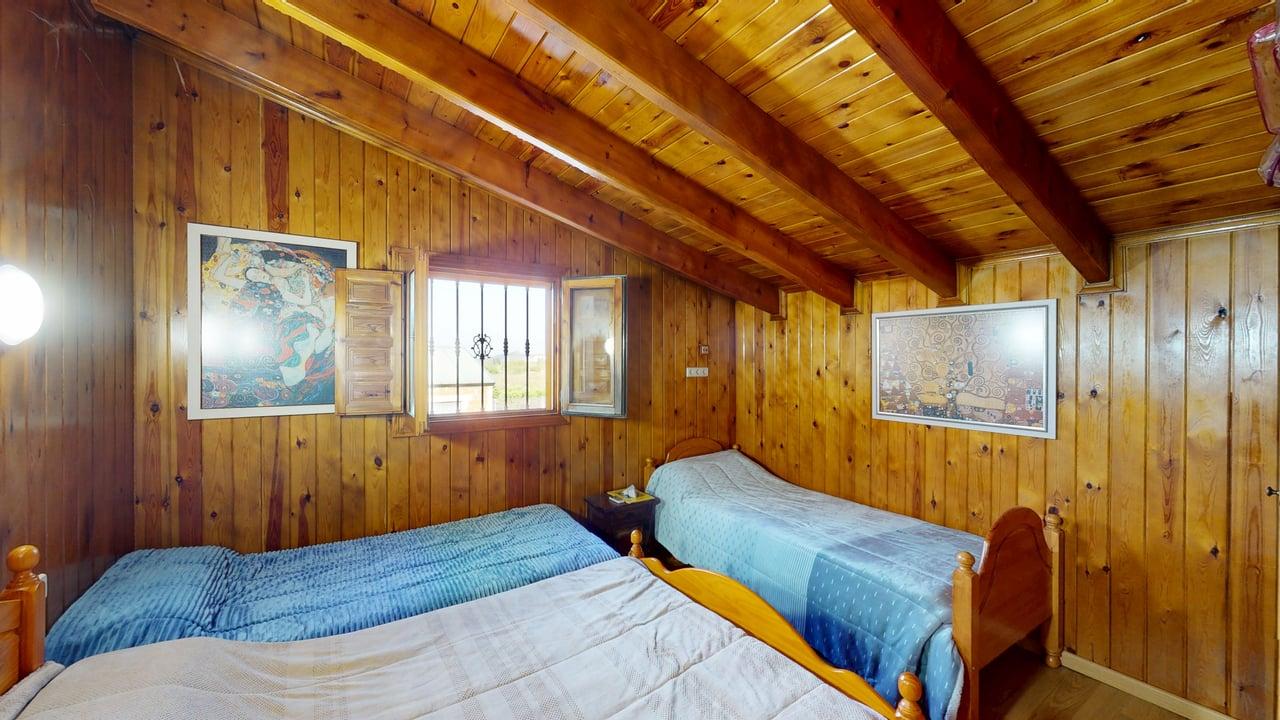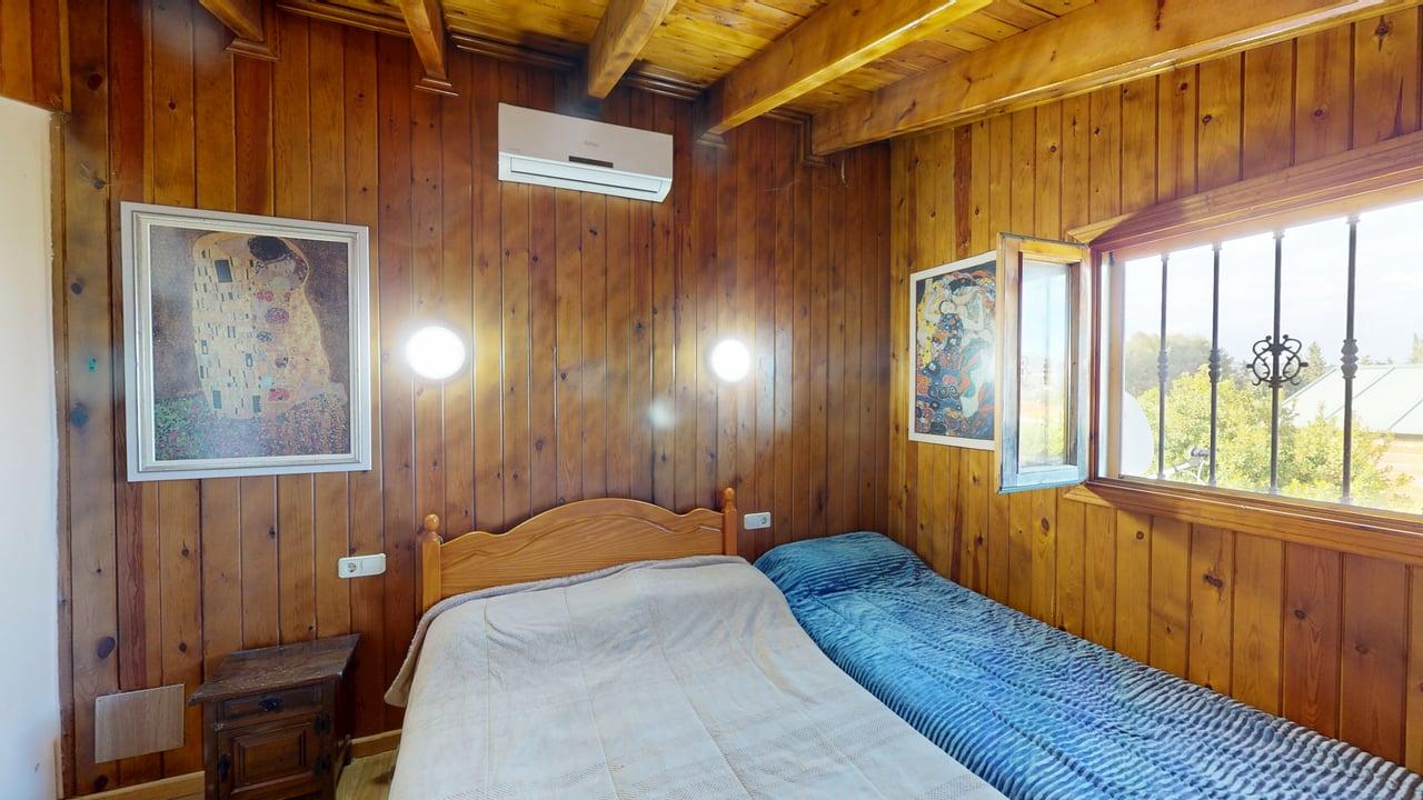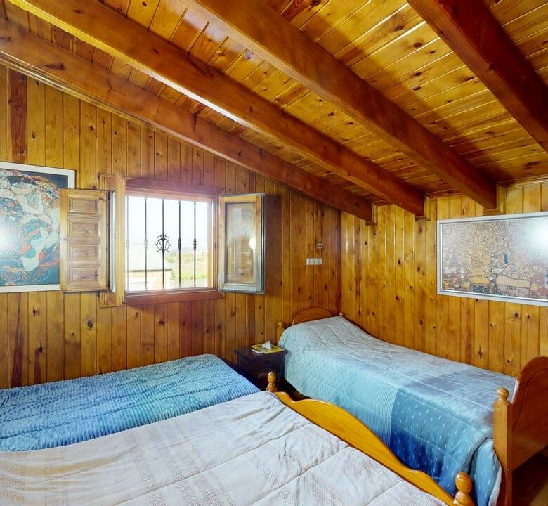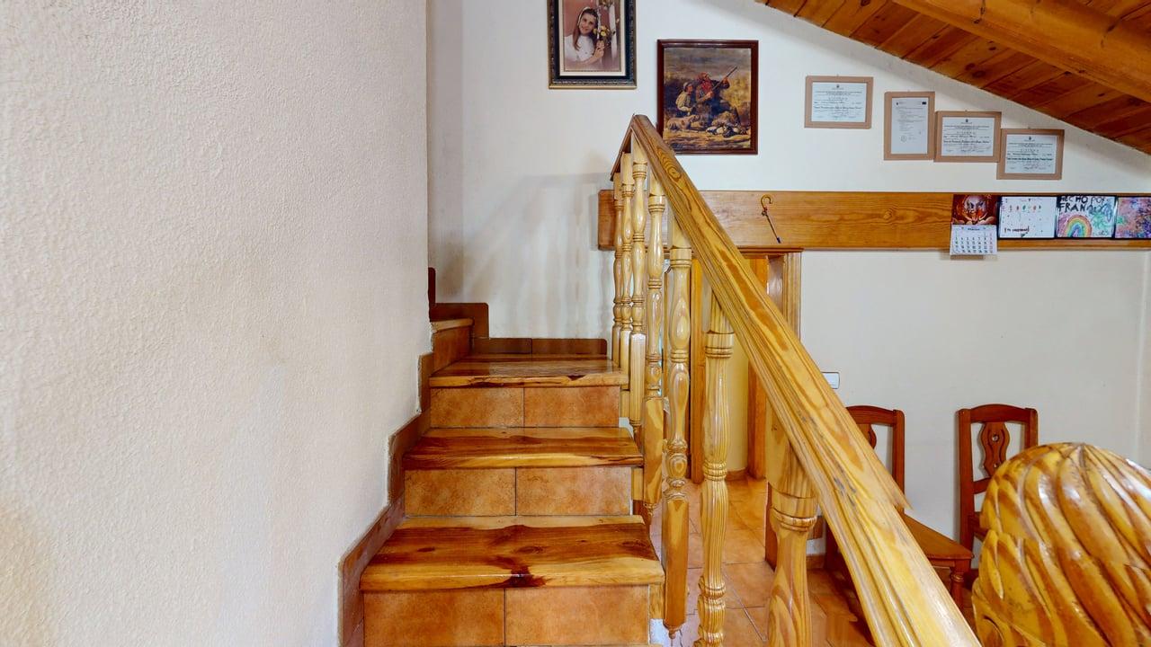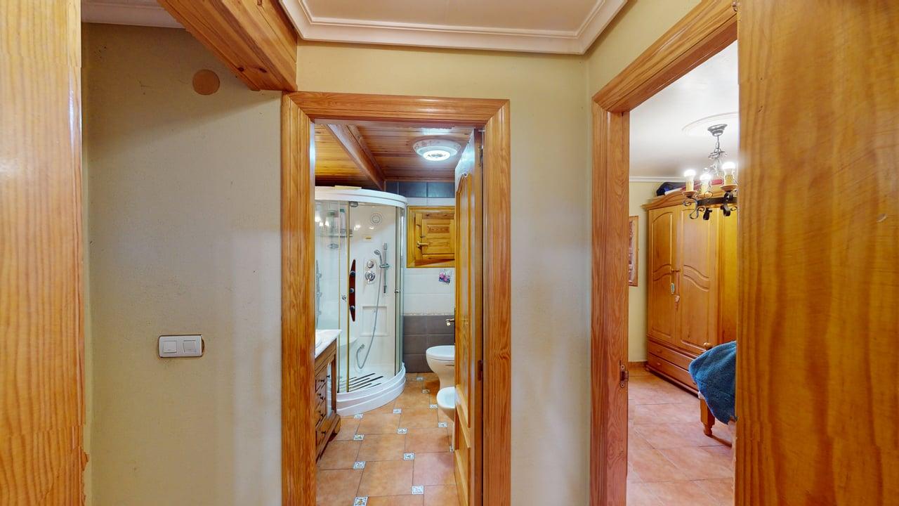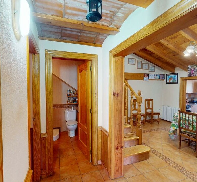 La zona de descanso se distribuye en la planta principal con un baño completo, una habitación individual y dos habitaciones dobles. Desde el salón, una elegante escalera de madera conduce a otra amplia habitación doble en la planta superior, aportando independencia y encanto.